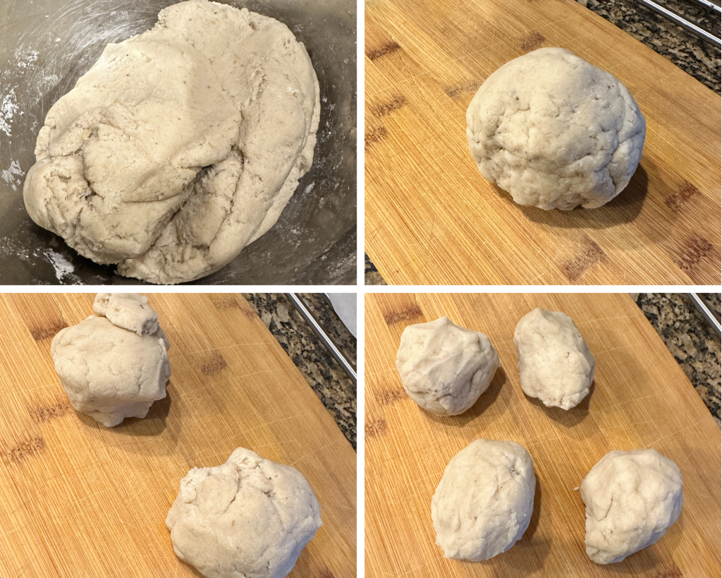 Once the dough is a good consistency, divide it in half, then in half, then in half. You should end up with balls that are just the right size. If you have a tortilla press they don't need to be round. No matter what shape they go in, the press will make them round.