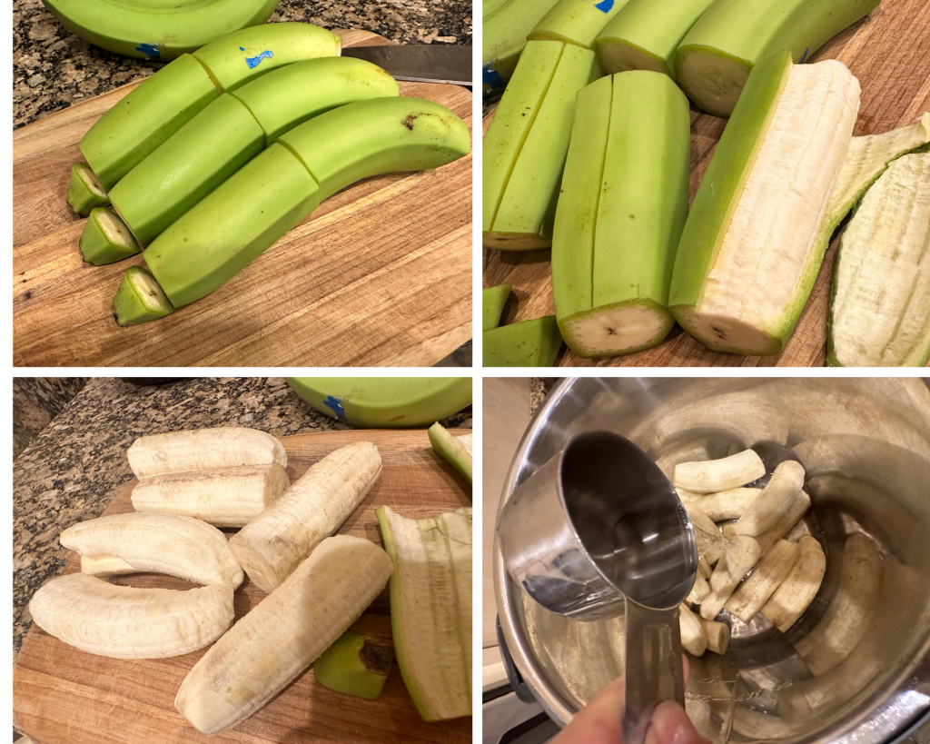 • Cut the ends off of the bananas cut them in half and score the side. Peel them by pulling the skin away where it's scored. Green bananas are more difficult to peel than ripe ones. Don't be concerned that they start to turn brown, green bananas oxidize quickly, but the process stops when they are cooked.