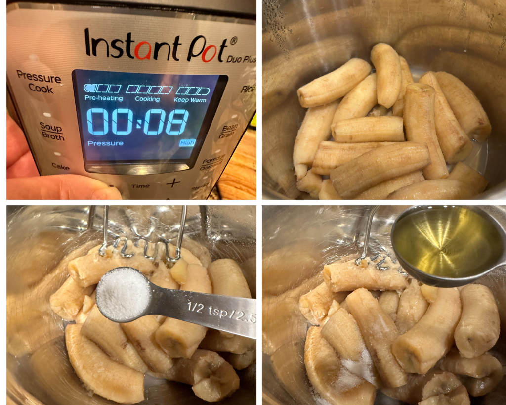 Put the cooked bananas and any remaining liquid from the pot into a large bowl and add 1/2 tsp Salt, 2 Tbsp Avocado Oil.